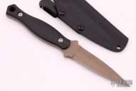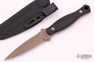 This Galvo Dagger by Les George features a bronze coated double-edged blade with .172" blade stock and .905" blade depth, full tang construction. The handle has black G-10 scales and a lanyard hole. Comes with a kydex sheath with Ulti-Clip. Comes with zippered case. New from maker at the 2021 Blade Show.