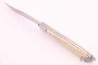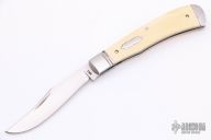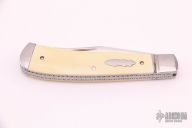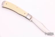 This single blade trapper by Tobin Hill features a hand rub satin finished clip point blade with a single nail nick. The handle features fluted stainless steel bolsters, stainless steel liners with fileworked spines, mammoth ivory covers, stainless steel spring. Has half-stop, flush in all positions. Includes a padded zippered case. New From Maker at the 2021 Blade Show.