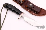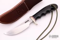 This Model 20 Ward Gay Special (non-catalog model) features a satin finished upswept carbon steel blade with notched thumbrest, .203" blade stock and 1.112" blade depth, hidden tang construction. The handle has a nickel silver guard, black linen micarta grip, red/white/blue spacers and a lanyard hole at the butt. Comes with brown leather sheath. New from maker.