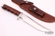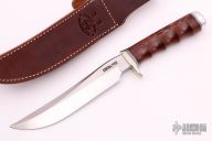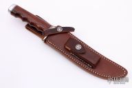 This model 3-7 by Randall Made Knives features a satin finished carbon steel blade with a false top edge, .214" blade stock and 1.284" blade depth, hidden tang construction. The handle has brass a nickel silver guard and duralumin butt with a finger groove cocobolo grip. Comes with a brown leather sheath. New from maker.