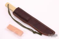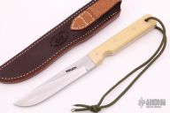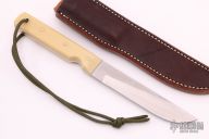 This Model 10 Salt Fisherman and Household Utility features a satin finish drop point blade with swedge and notched thumbrest, .137" stock and 0.937" blade depth. The handle has bone linen micarta scales over full tang construction. Brass lanyard tube with lanyard in pommel. Includes a brown leather sheath and original paper wrapping. New from the 2021 Blade Show.