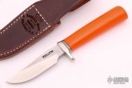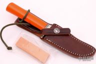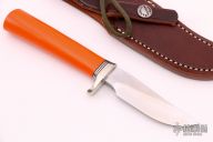 This GTR by Randall Made Knives features a satin finished blade with notched thumbrest, .165" blade stock and .896" blade depth, hidden tang construction. The handle has a nickel silver guard, orange G-10 grip and black/duralumin spacers. Knife comes with a brown leather sheath with belt loop and original paper wrapping. New from the 2021 Blade Show.