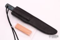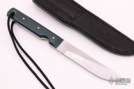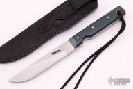 This Model 10 Salt Fisherman and Household Utility features a satin finish drop point blade with swedge and notched thumbrest, .129" stock and 0.927" blade depth. The handle has ranger green G-10 scales over full tang construction. Brass lanyard tube with lanyard in pommel. Includes a black leather sheath and original paper wrapping. New from the 2021 Blade Show.