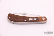 This Trapper by Enrique Pena features a hand rub satin finished blade with nail nick. The handle has natural canvas micarta bolsters, burlap micarta covers over white G-10 liners, stainless steel escutcheon, liners and spring. Half-stop, flush in all positions. Comes with a zippered case. New from maker at the 2021 Blade Show.