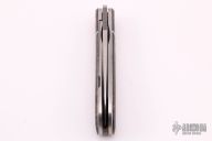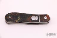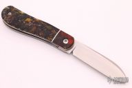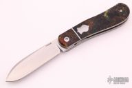 This Dogleg Front Flipper by Enrique Pena features a hand rub satin finished drop point blade with a notched thumbrest and front flipper. The handle has rag micarta bolsters, rag micarta scales over white liners, rag micarta backspacer.  Stainless steel shield. Includes padded zippered case. New from Maker at the 2021 Blade Show.