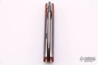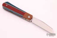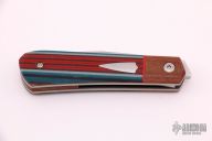 This Raptor Front Flipper by Enrique Pena features a hand rub satin finished wharncliffe blade with swedge, notched thumbrest and front flipper. The handle has a natural canvas micarta bolsters, Mexican Blanket canvas micarta scales over red liners, natural canvas micarta backspacer. Includes padded and zippered case. New from maker at the 2021 Blade Show.