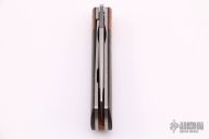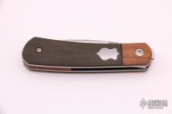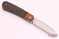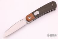 This Apache Front Flipper by Enrique Pena features a hand rub satin finished blade with nail nick. The handle has natural canvas micarta bolsters, green canvas micarta covers with black liners, titanium liners and natural canvas micarta backspacer. Comes with zippered case. New from maker at the 2021 Blade Show.