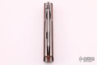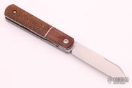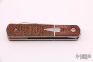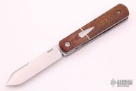 This Barlow Front Flipper Linerlock by Enrique Pena features a hand rub satin finished blade with front flipper and notched thumbrest. The handle has brown micarta bolsters, burlap micarta scales with a stainless steel escutcheon, white liners, titanium liners and natural canvas micarta backspacer. Comes with a zippered case. New from maker at the 2021 Blade Show.
