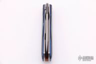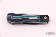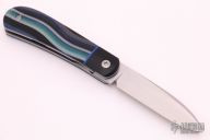 This Zulu Front Flipper by Enrique Pena features a hand rub satin finished blade with swedge, notched thumbrest and front flipper. The handle has black canvas micarta bolsters, Mexican Blanket canvas micarta scales over blue liners, natural canvas micarta backspacer. Stainless Steel Shield.  Includes padded and zippered case. New From Maker at the 2021 Blade Show.