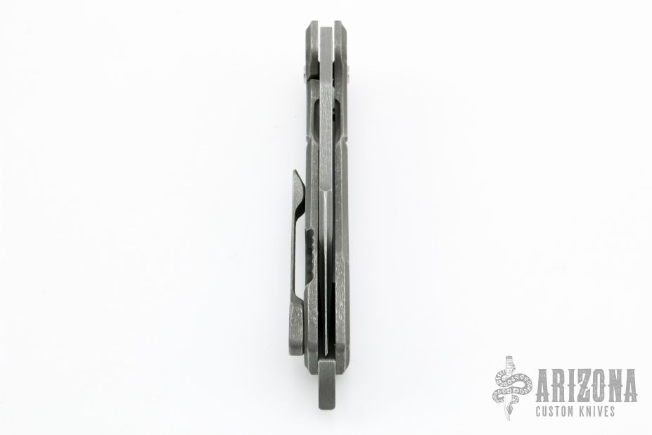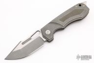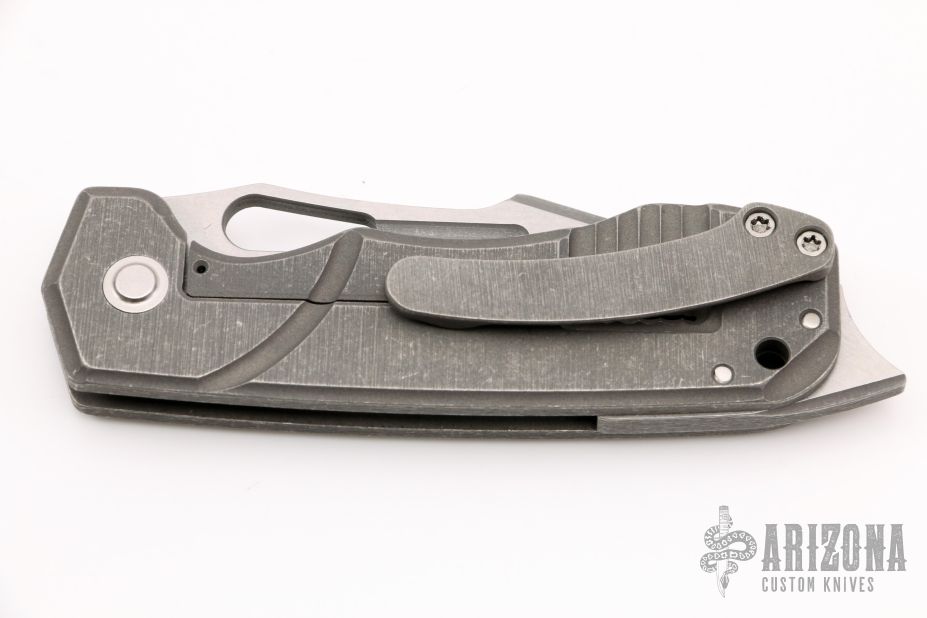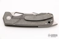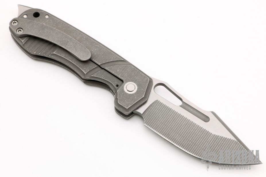 This Blood and Thunder V1 by Jason Stout features a tumble finished blade with milled bevels, fullers and a thumbhole. The handle has a milled and tumbled titanium frame with a green canvas micarta inlay, matching tip up pocket clip and a dark tumbled and a D2 steel backspacer. Nice detent, lockup and blade seating. Excellent condition. Comes with a zippered case and COA dated TKI 2021.