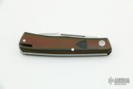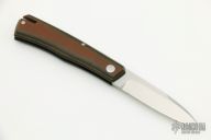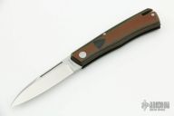 This Mini Solitude TL by Jared Oeser features a hand rub satin finished blade with nail nick. The handle has brown/black "two-line" Westinghouse paper micarta covers with black paper micarta escutcheon, black G-10 liners, stainless steel backspacer. Nice lockup and blade seating. Comes with original box, leather slip sheath and COA dated 6-2-21. New from maker at the 2021 Blade Show.