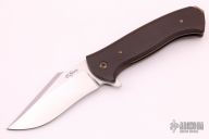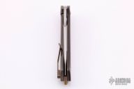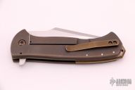 This Tryfer by David Sharp features a hand rubbed satin finished clip point recurve blade with false top edge and flipper. The handle has an anodized and tumble finished titanium frame and liner, green canvas micarta scales, bronzed and orange peel finished titanium tip up clip and backspacer with lanyard hole at the butt. Nice detent, lockup and blade seating. Comes with zippered case. Excellent condition.