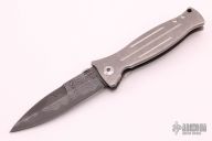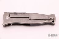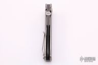 This M3 by Les George features a San Mai Damascus blade with false top edge and knurled thumbdisc, .249" blade stock. The handle has a tumbled titanium frame with 3 milled fullers and a matching tip up clip, black G-10 backspacer. Nice detent, lockup and blade seating. Excellent condition.