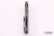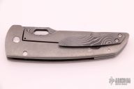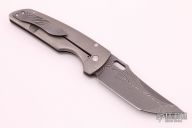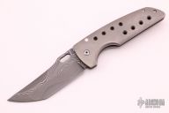 This Hokkaido by John Barker features a San Mai Damascus tanto blade with notched thumbrest and thumbhole. The handle has a tumble finished titanium frame, Damascus tip up clip and floating backspacer. Rides on bearings, nice detent, lockup and blade seating. Has some light scratches on the blade, otherwise excellent condition.