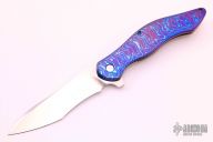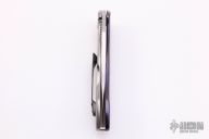 This Peligro R by Gerry McGinnis features a hand rub satin finished tanto recurve blade with notched thumbrest and flipper. The handle has a MokuTi and orange peel finished titanium frame, orange peel finished titanium backspacer, tip up zirconium clip. Comes with a zippered case and COA. Nice action, detent, lockup, and blade seating. New from maker at the 2021 Blade Show.