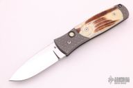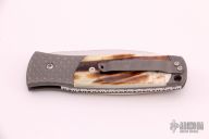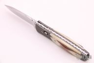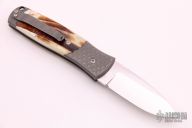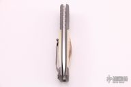 This Automatic by Z Custom Knives features a mirror polished drop point blade with file worked thumbrest. The handle is comprised of a bead blasted titanium frame with hippo tooth inlays and push button over a fileworked stainless steel backspacer. The bead blasted titanium tip up clip is positioned for right hand carry. Has some scuffs/scratches, otherwise good condition. Hard to find!