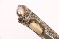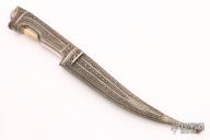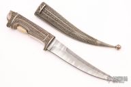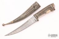 This Persian Fighter by Zaza Revishvili and Gil Hibben features a Damascus blade with false top edge, .255" blade stock and 1.221" blade depth, hidden tang construction. The handle has a nickel silver frame with sterling silver overlays done by Zaza Revishvili, has a mammoth ivory inlay. The handle and the scabbard match. Excellent condition. Comes with zippered case. Amazing detail!