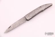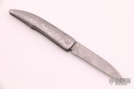 This slipjoint by Bob Terzuola features a Damascus blade with nail nick. The handle has a Damascus frame with sterling silver backspacer. Nice blade seating. Excellent condition.