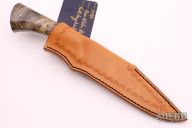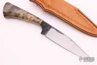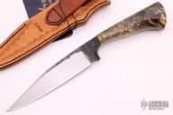 This Brute De Forge Hunter by Journeyman Smith Kevin King features a hand rub satin finished blade with forge finished flats and forged guard, .231" blade stock and 1.110" blade depth, full tapered tang construction. The handle has box elder burl scales. Comes with COA. New from maker at the 2021 Blade Show.