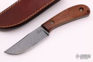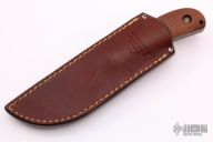 This Unnamed by Patrick Doyle has a hand rubbed, then etched and patina'd blade with false top edge, thickness of .129" and a depth of .942", full tang construction. The handle has vintage cross-cut natural canvas micarta scales, green and brown liners, lanyard hole, screws are stipple textured and bronzed. Knife comes with a brown leather sheath with pocket clip made by Treeman Leather Shop. New from maker at the 2021 Blade Show.