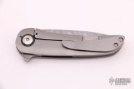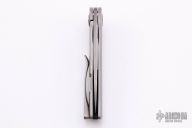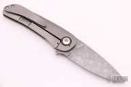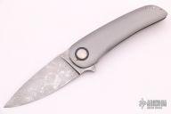This P1 Framelock Flipper by Edward R. Knives features a Vegas Forge SS Damascus blade with notched flipper. The handle has a bead blasted titanium frame, carbon fiber pivot collars and backspacer, tip up titanium clip. Rides on bearings, nice detent, lockup and blade seating. Comes with zippered case and COA dated "Blade Show 2021". New from maker at the 2021 Blade Show.