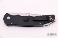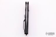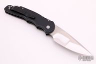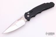 This Tactical Response 4.5 by Pro-Tech has a mirror polished compound ground spear point blade with satin finished flats. The handle has a black aluminum frame with a matching titanium tip up clip. Black Lip Pearl push button.  Comes with original box and papers. New from maker.