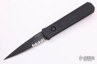 This 921 SWAT Godfather features a black blade with notched thumbrest. The handle has a black aluminum frame with black hardware, black push button and black stainless steel tip up clip.  Comes with original box and papers. New From Maker.