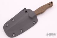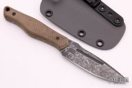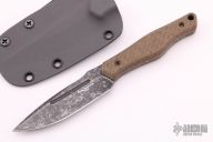 This fixed blade Gerry McGinnis features an acid tumble finished blade with notched thumbrest and green canvas micarta scales, .157" blade thickness and .958" blade depth, full tang construction. Comes with a kydex sheath. Excellent condition.