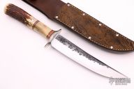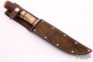 This Fighter by Jim Behring features a satin finished and hammer marked hollow ground blade with a false top edge, .238" blade thickness and 1.307" blade depth, hidden tang construction. The handle has a nickel silver guard and butt, stag grip, black/red/yellow spacer pattern. Great look and feel. Comes with brown leather sheath. New from maker at the 2021 Blade Show.