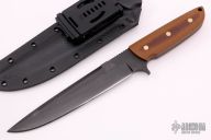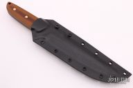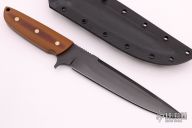 This Hellion by Kee Made Knives features a black blade with false top edge and notched thumbrest, .260" blade stock and 1.396" blade depth, full tang construction. The handle has natural canvas micarta scales with brass pins. Comes with a kydex sheath and COA. New from maker at the 2021 Blade Show.