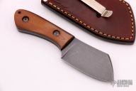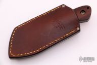 This T.L.B. by Patrick Doyle has an acid tumbled blade with a thickness of .130" and a depth of 1.283", full tang construction. The handle has vintage natural canvas micarta scales, green/black liners, lanyard hole, screws are stipple textured and bronzed. Knife comes with a brown leather sheath with pocket clip made by Treeman Leather Shop. New from maker at the 2021 Blade Show.
