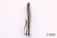 This T Arc Front Flipper by Brad Zinker features a Vegas Forge Web Damascus blade with checkered thumbrest and flipper. The handle has mammoth ivory scales, anodized titanium liners with laser engraved interiors and a tip up anodized titanium clip. Rides on bearings, nice detent, lockup and blade seating. Comes with zippered case. New from maker at the 2021 Blade Show.