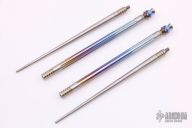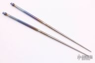 These titanium chopsticks by Steven Kelly are a three-piece design with the screw on end caps that are made of titanium. Custom anodized. Light weight and very cool. Come in a leather sheath. Brand new from the maker at the 2021 Blade Show.