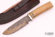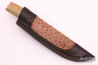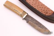 This Knife by Herb Derr features a Bird's Eye Pattern Damascus blade with file worked spine, .179" blade stock and 1.490" blade depth, hidden tang construction. The handle is comprised of a nickel silver guard and pommel with buckeye burl and nickel silver spacer and a sea cow rib bone grip. Includes a brown leather sheath with ostrich skin inlay. New from maker at the 2021 Blade Show.