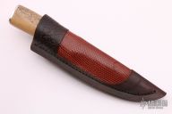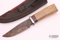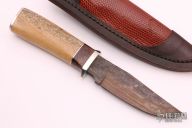 This Knife by Herb Derr features a Bird's Eye Pattern Damascus blade with file worked spine, .171" blade stock and 1.338" blade depth, hidden tang construction. The handle is comprised of a nickel silver guard and pommel with buckeye burl and nickel silver spacer and a sea cow rib bone grip. Includes a brown leather sheath with Lizzard skin inlay. New from maker at the 2021 Blade Show.