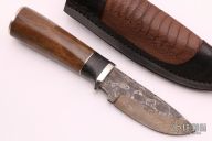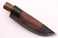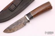 This Knife by Herb Derr features a Bird's Eye Pattern Damascus blade with file worked spine, .175" blade stock and 1.388" blade depth, hidden tang construction. The handle is comprised of a nickel silver guard and pommel with redwood burl and nickel silver spacer and a oosic grip. Includes a brown leather sheath with ostrich leg skin inlay. New from maker at the 2021 Blade Show.