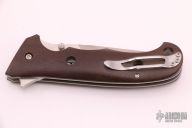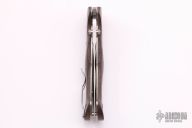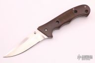 This Military Grade Cruiser Flipper by Jim Hammond features a satin finished blade with false top edge, notched thumbrest and dual thumbstuds. The handle has green linen micarta scales, titanium liners and tip up stainless steel clip. Nice detent and lockup. Comes with a zippered case. Excellent condition.