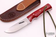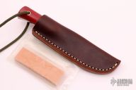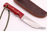 This Model 10 Salt Fisherman and Household Utility features a satin finish blade with notched thumbrest. 0.133" blade stock and 0.924" blade depth. The handle is comprised of red linen micarta scales over full tang construction. Brass lanyard tube with lanyard in pommel. Includes a brown leather sheath, sharpening stone and original paper wrapping. New from maker.