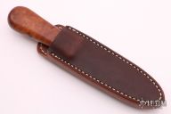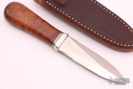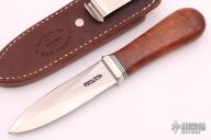 This Model 24 Guardian by Randall Made Knives features a satin finished double-edged blade with notched finger rests, .170" blade stock and .994" blade depth, hidden tang construction. Amboyna burl wood grip with black/duralumin spacers and a nickel silver guard. Both edges of the blade are sharpened with 1" of thumb notches. This model was designed in 1978 for use by police, undercover agents and law enforcement personnel for self-protection and as a back-up weapon. Comes with a brown leather sheath w/ boot clip and original paper wrapping. New from maker.