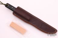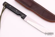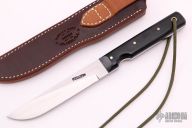This Model 10 Salt Fisherman and Household Utility features a satin finish drop point blade with swedge and notched thumbrest, .121" blade stock and .924" blade depth. The handle is comprised of black linen micarta scales over full tang construction. Brass lanyard tube with lanyard in pommel. Includes a brown leather sheath and original paper wrapping. New from maker.