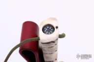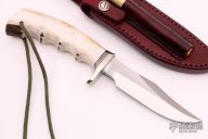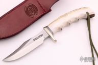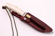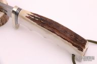 This Stanaback Special from Randall Made Knives features a satin finished clip point blade with sharpened top edge and notched thumbrest, 0.227" blade stock and 1.112" blade depth, hidden tang construction. The handle has a nickel silver guard with black and duralumin spacers and a finger grip stag grip with a compass in the butt. Includes maroon leather sheath with sharpening steel and belt loop, original paper wrapping. New from maker.