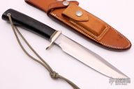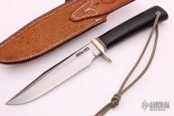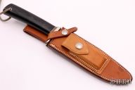 This Model 5 Camp and Trail Knife by Randall Made Knives features a satin finished blade with false top edge and notched thumbrest, .202" blade stock and 1.142" blade depth, hidden tang construction. The handle has a nickel silver single guard and a black linen micarta grip with red/white/blue spacers and a compass in the butt. Comes with a roughback brown leather sheath with belt loop. Excellent condition.