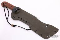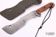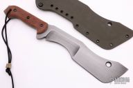 This Custom M-18 by TM Hunt features a gun metal finished recurve blade with notched thumbrest and blade spine tip, .250" blade stock and 3" blade depth, full tang construction. The handle has checkered natural canvas micarta scales with extended tang with notches and a lanyard hole. Comes with a kydex sheath. #416 on the blade. New from maker at the 2021 Blade Show.
