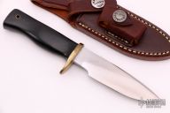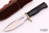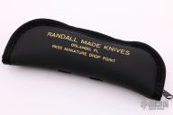 This Miniature model 5 by Randall Made Knives features a satin finished drop point blade with notched thumbrest, .160" blade stock and .890" blade depth, full tang construction. The handle has a brass guard, black linen micarta grip and lanyard hole. Each miniature Randall model has a transponder in the handle matching the serial number of the knife, in this case "580/1203". Comes with brown leather sheath, original paper wrapping and a Randall zippered case. Excellent condition.