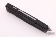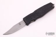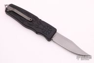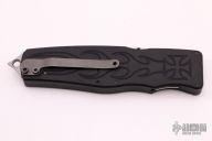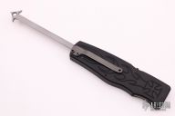 This Safe-to-Carry (STC) Asp OTF by Rob Dalton opens by pressing forward on the safety and down on the bar on the handle spine. The knife closes by pressing the locking mechanism on the opposite side and pulling the charging handle on the rear half way then pressing the safety forward and the release bar down at the same time while pulling the charging handle the rest of the way. Very strong and fast opening. The blade is a clip point and is bead blasted. The handle is black aluminum with a tip down bead blasted titanium clip. Has a couple very light scuffs, otherwise excellent condition.