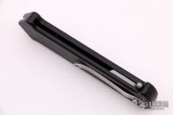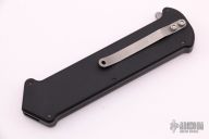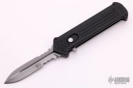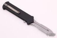 This 2nd Release Cupid OTF automatic by Rob Dalton features a chisel ground bead blast double-edged and serrated blade and milled black aluminum handle. Fires via push button and retracts by holding the button and moving the slider on the side of the knife. Has a few light scuffs, otherwise excellent condition. #00265.
