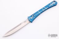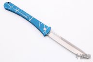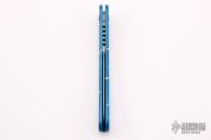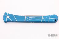 This Prototype Huck XXX Toothpick from Rob Dalton is a James Huckaback design and features a satin spear point blade with false top edge. The handle has a splash anodized aluminum frame. This is a very large auto with overall length over 12". Sawtooth on spine. #056.  Excellent Condition.