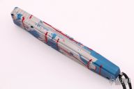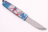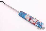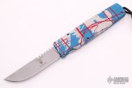 This Border Patrol Patriot OTF auto by Rob Dalton is 1 of 50. It opens by pressing down on the bar on the handle spine. The knife closes by pressing the locking mechanism on the opposite side and pulling the charging handle on the rear. Very strong and fast opening. Nicely contoured splash anodized aluminum handle. Excellent Condition.