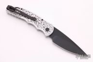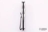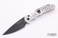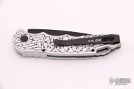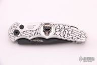 This TR-5.62 by Pro-Tech Knives features a black spear point blade. The handle has a silver aluminum handle with Shaw skull inlay, barbwire graphic, stainless steel backspacer with lanyard hole, tip up blade stainless steel clip.  Comes with original box and papers. #214 of 300.  Excellent condition.