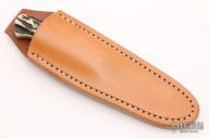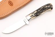 This knife by Bill Kennedy features a satin finished drop point blade with a full tang construction.  .089" Blade Stock.  .672" Blade Depth. The handle features a nickel silver guard, stag scales and mosaic pins.  Includes a brown Parson’s leather sheath.  New from maker.